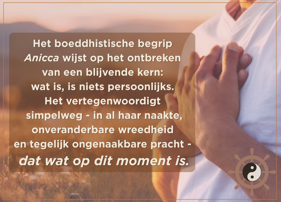 Het boeddhistische begrip van Anicca wijst er – op indirecte wijze – echter op dat zo’n blijvende kern ontbreekt: het wijst op anatta, op het ‘geen-zelf’. Wat is, is vergankelijk en daarom is het niets persoonlijks. Wat is, vergaat en is simpelweg – in al haar naaktheid, onveranderbare wreedheid en tegelijk ongenaakbare pracht – enkel dat wat er op dit moment is. Het heeft niet zoveel te maken met wat wij willen of wensen en er is ook geen sprake van recht of rechtvaardigheid. Wat er is, is – en het volgende moment verandert het, transformeert het, lost het op in het niets waar het vandaan kwam. Dat is de leegte achter de werkelijkheid: daar ligt het werkelijke ongemak – en de kern van de onmacht die ieder van ons ervaart in het leven.